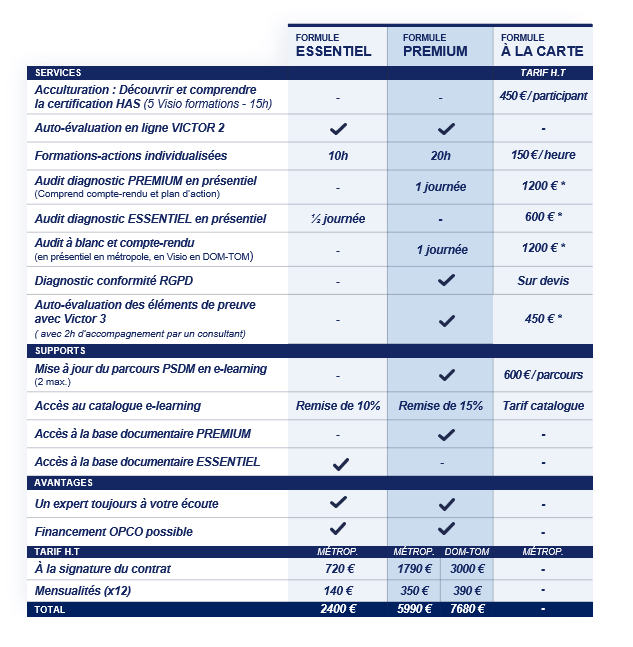 Plusieurs formules sont proposées pour s’adapter aux spécificités et aux contraintes de chacune des entreprises accompagnées (ESSENTIEL, PREMIUM et à la carte)